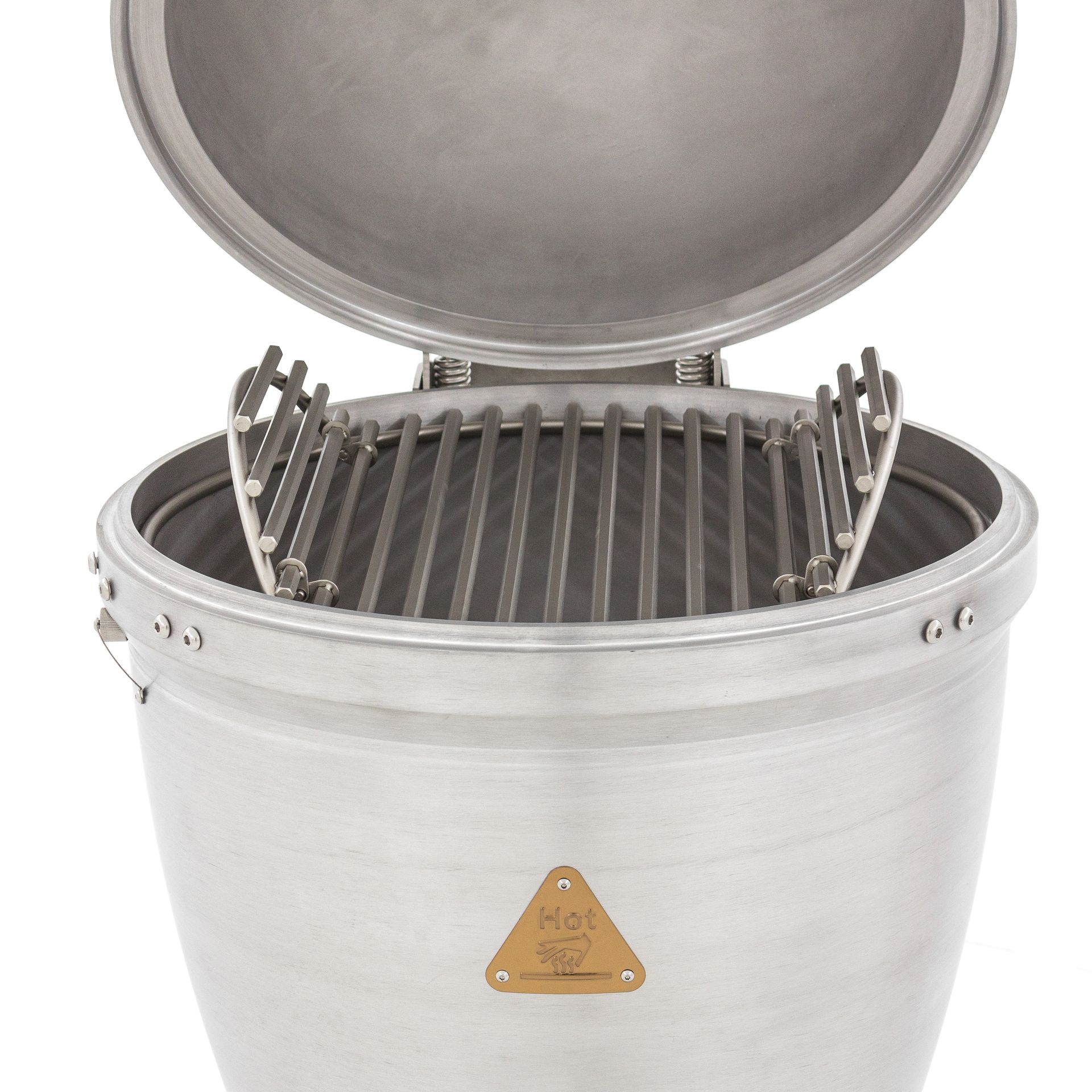 - Klappbare Grillfläche – Der obere Grillrost kann hochgeklappt werden, sodass man Holz oder Holzkohle nachfüllen kann, ohne den Rost vollständig abnehmen zu müssen